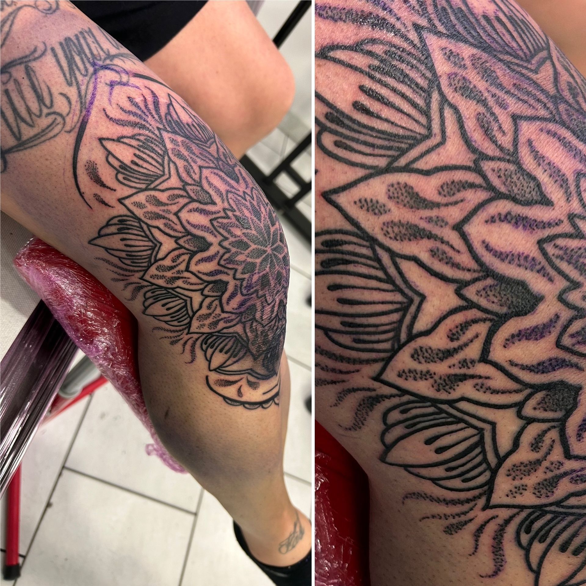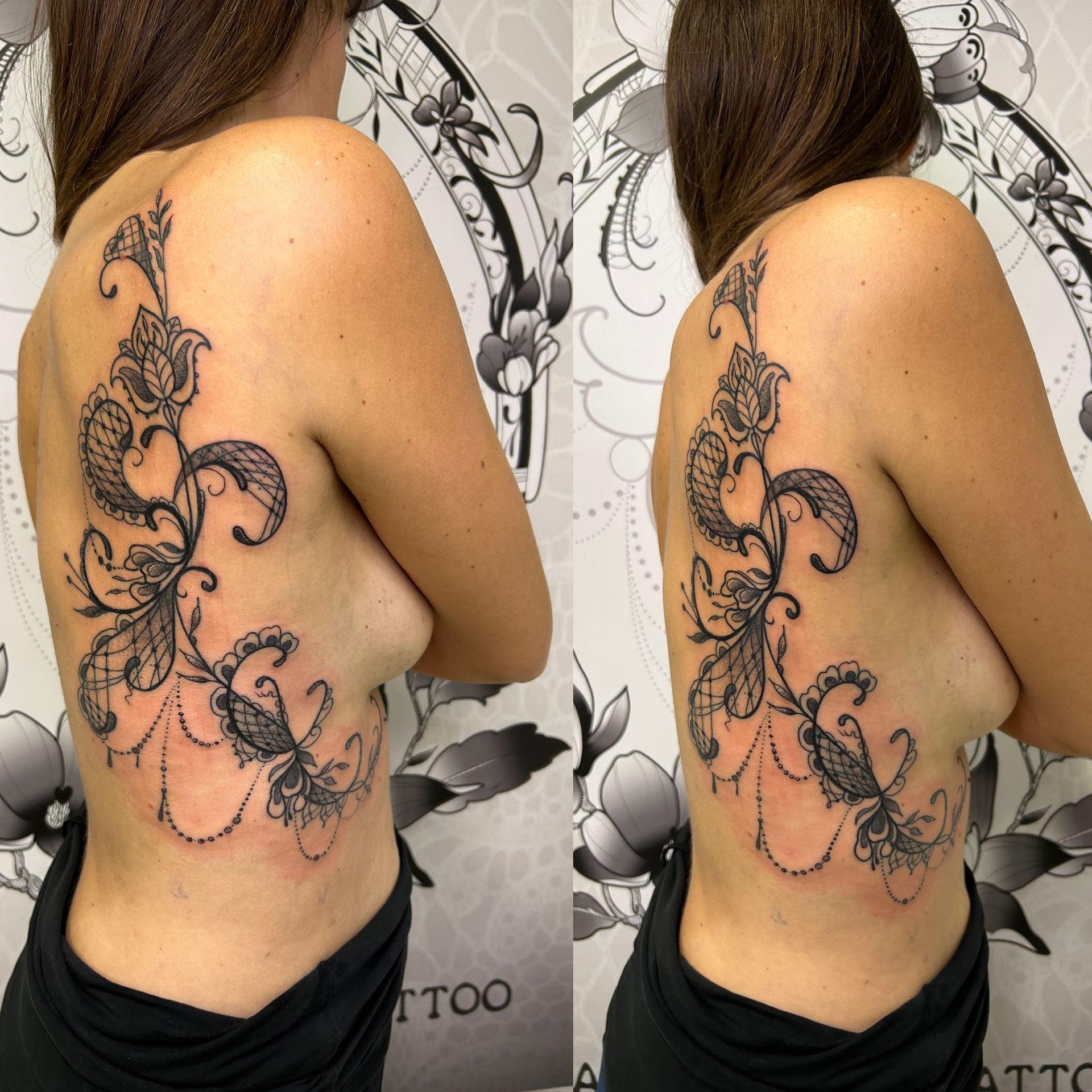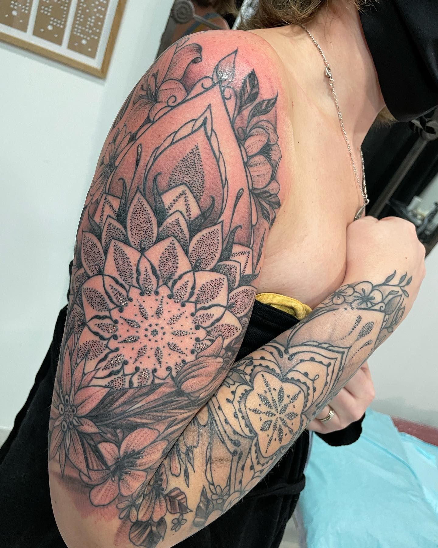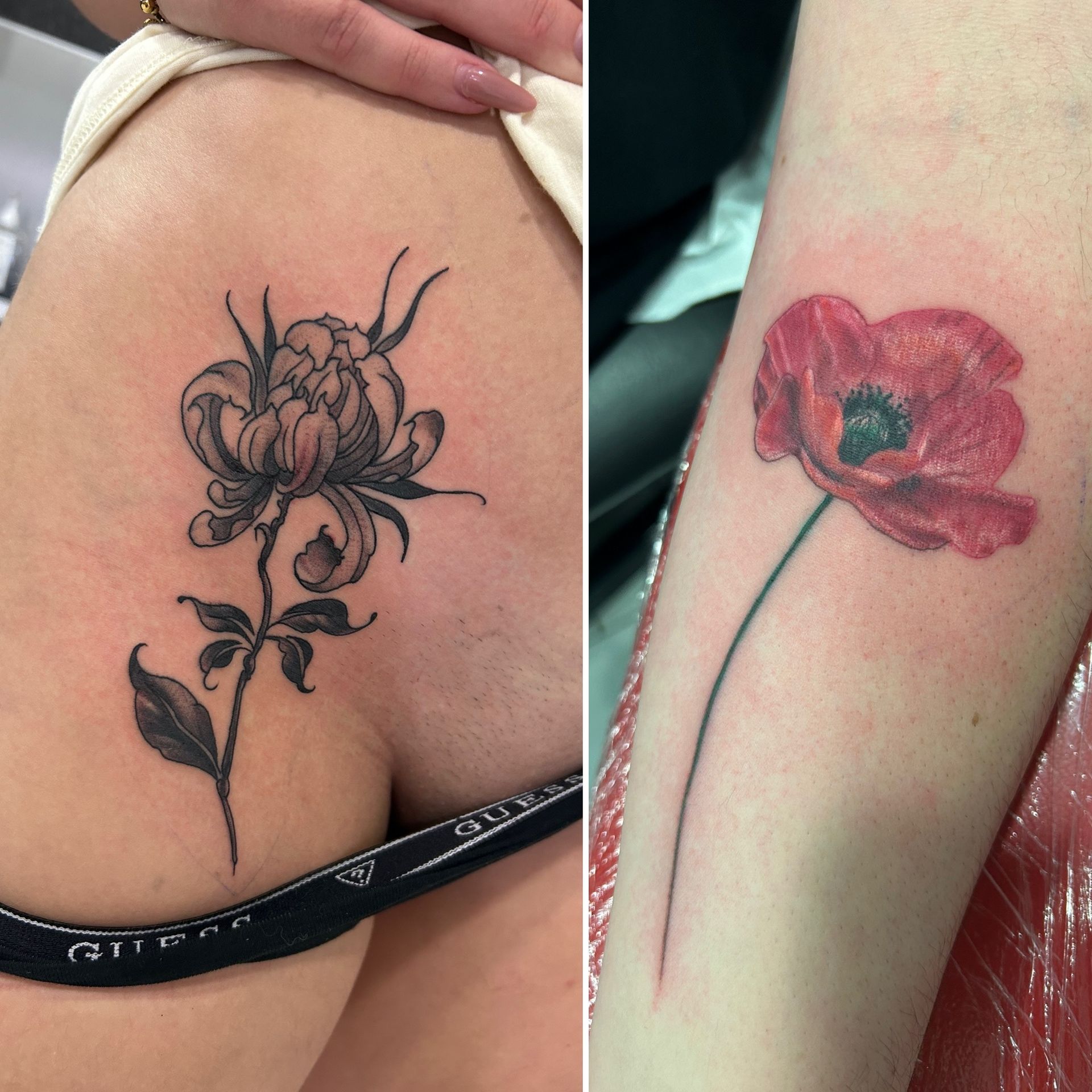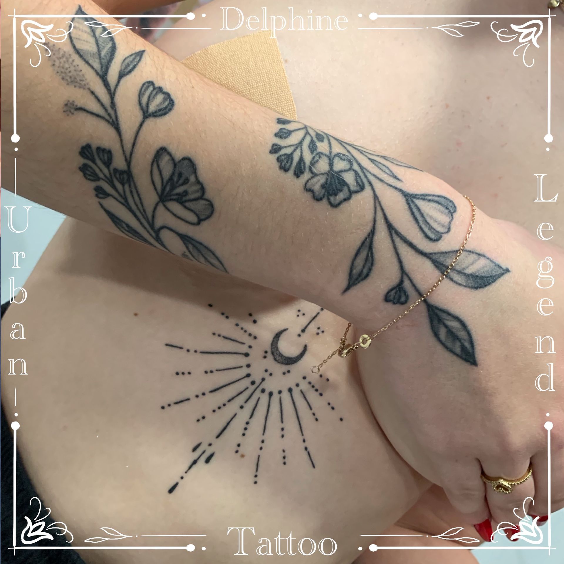 Tatoueuse depuis 12 ans, Delphine propose un univers très girly orné de fleurs et de dentelle aux tendances réalistes, mais aussi un travail d'inspiration mandala en dot, en noir ou en couleur.