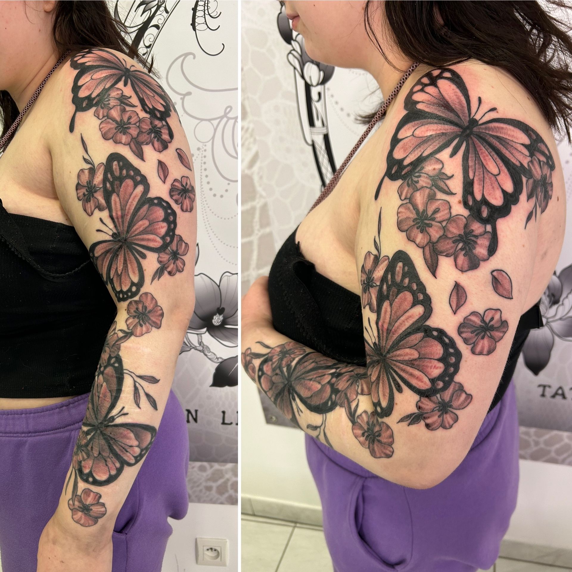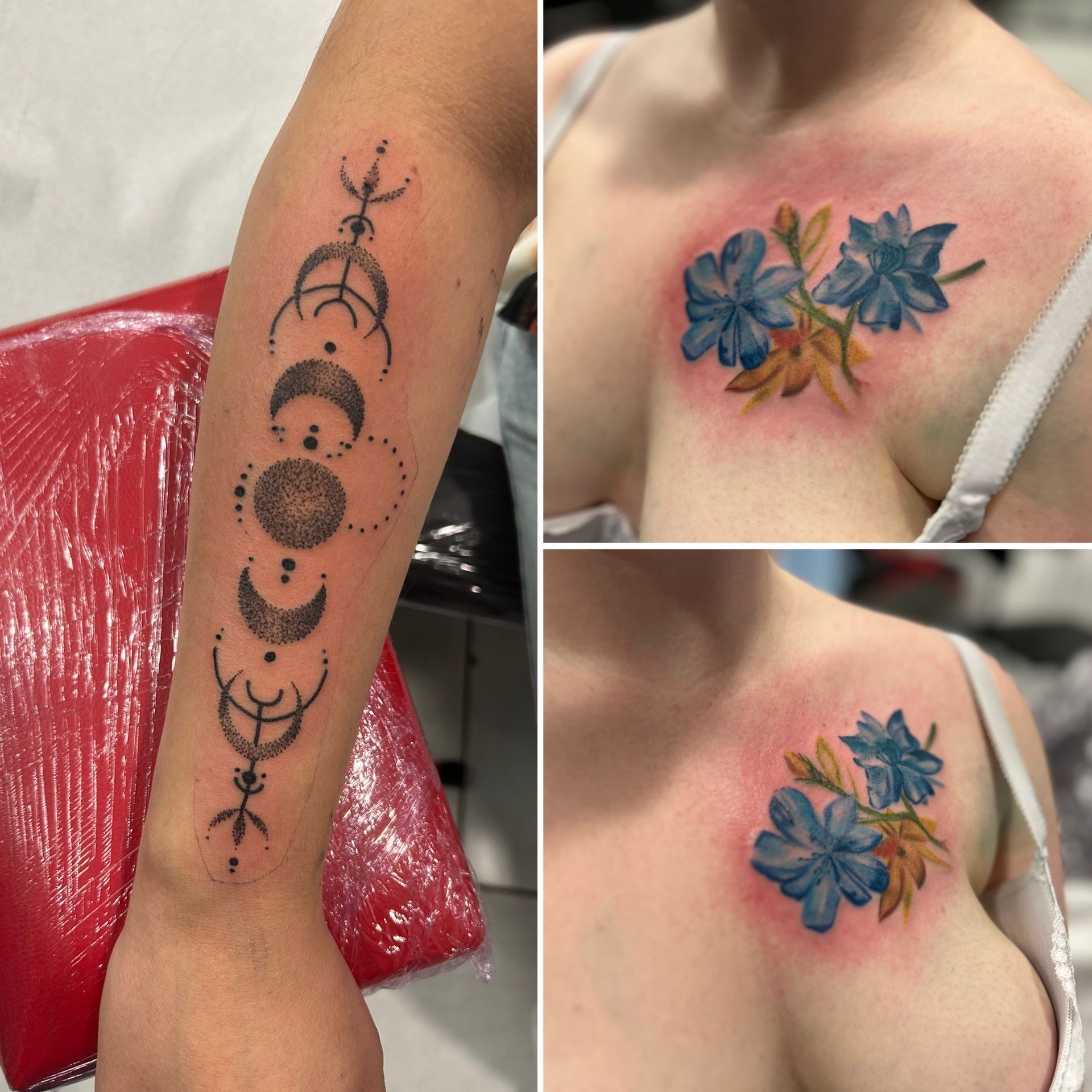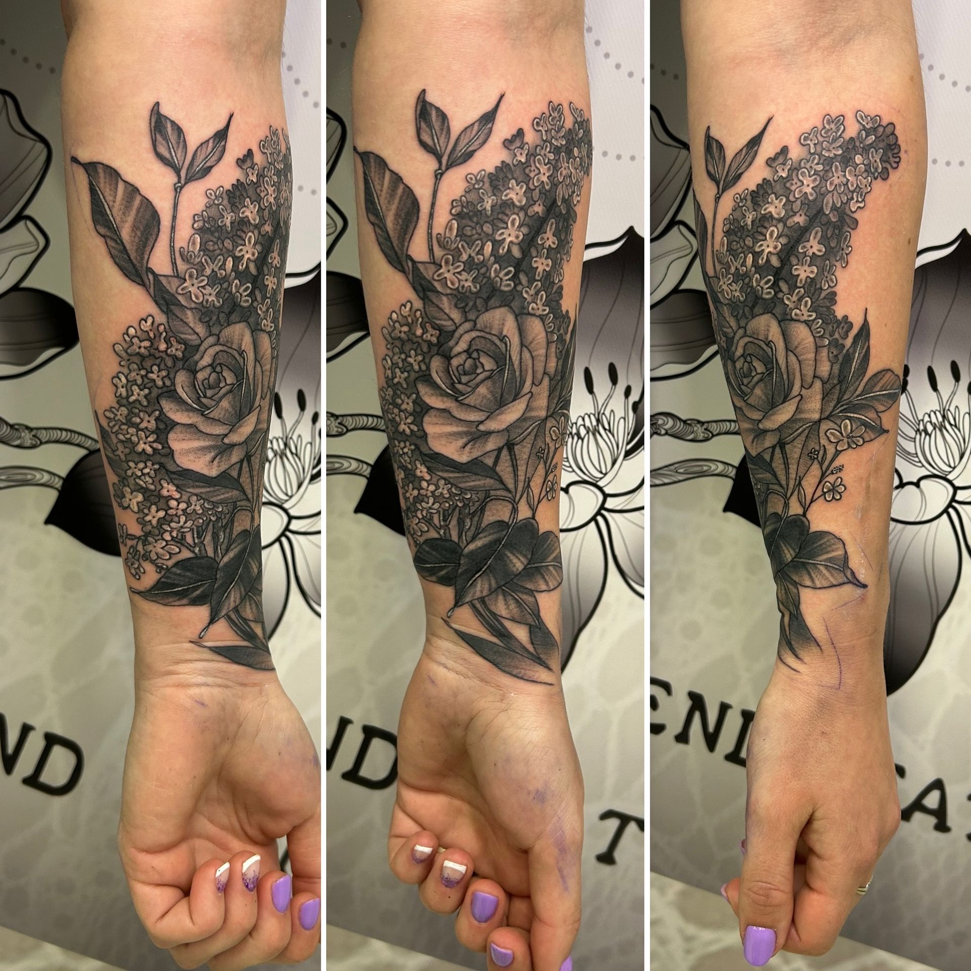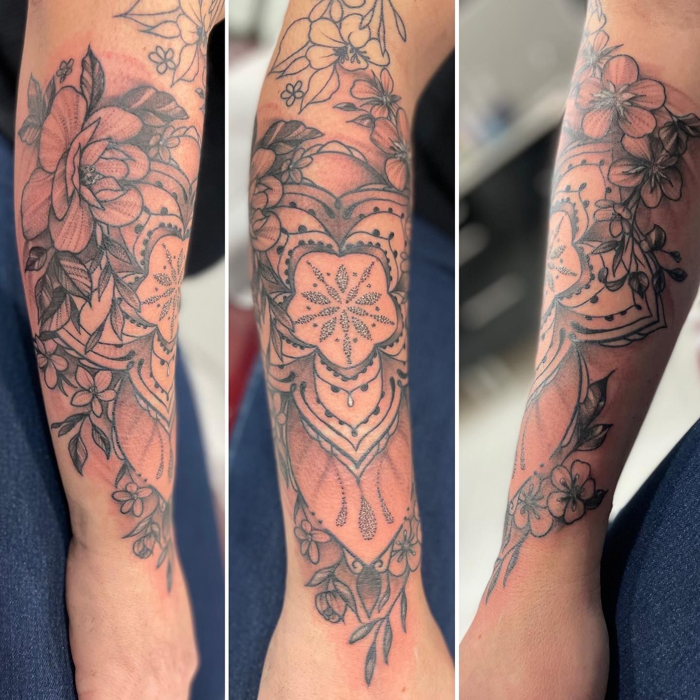 Tatoueuse depuis 12 ans, Delphine propose un univers très girly orné de fleurs et de dentelle aux tendances réalistes, mais aussi un travail d'inspiration mandala en dot, en noir ou en couleur.