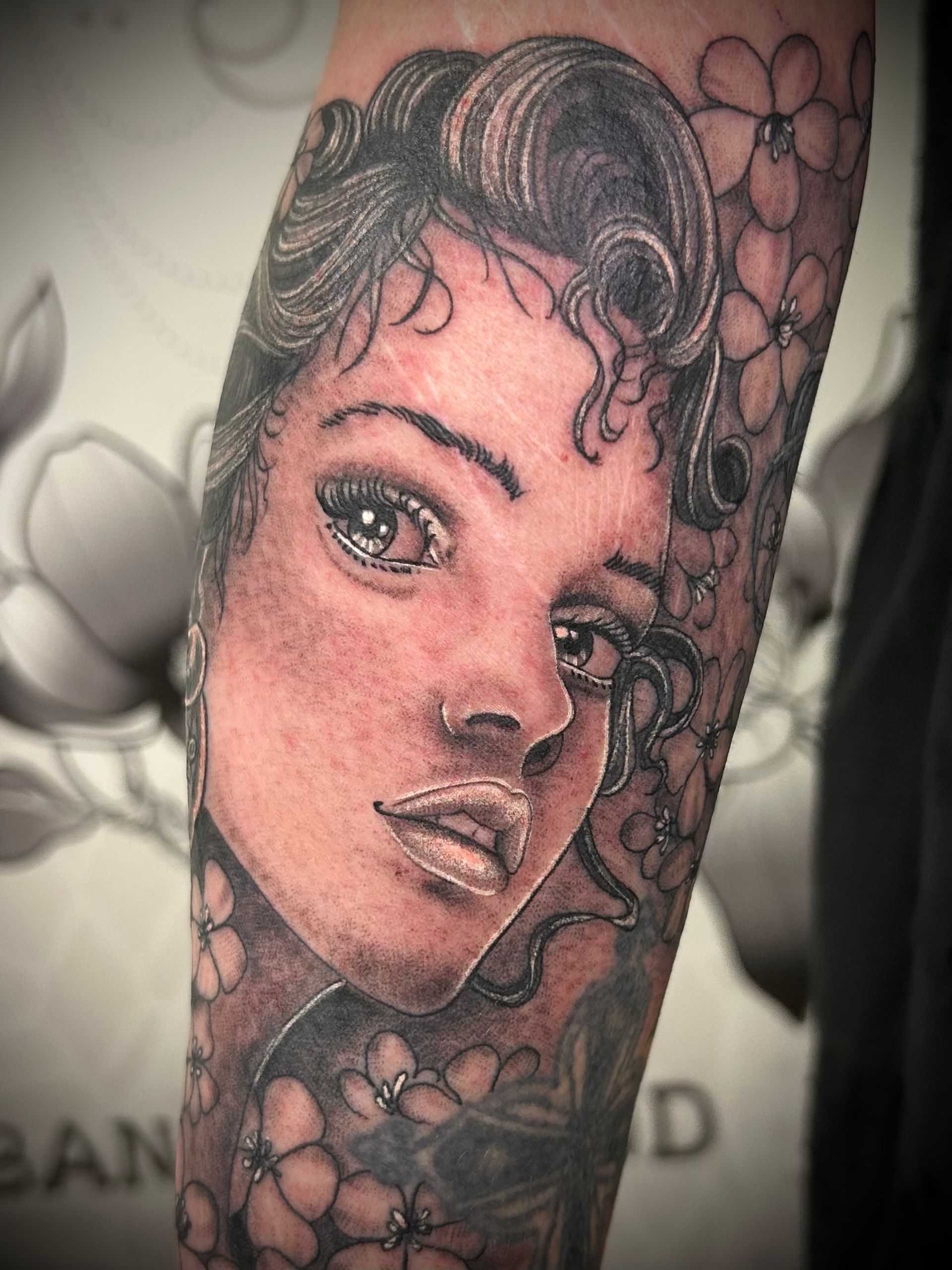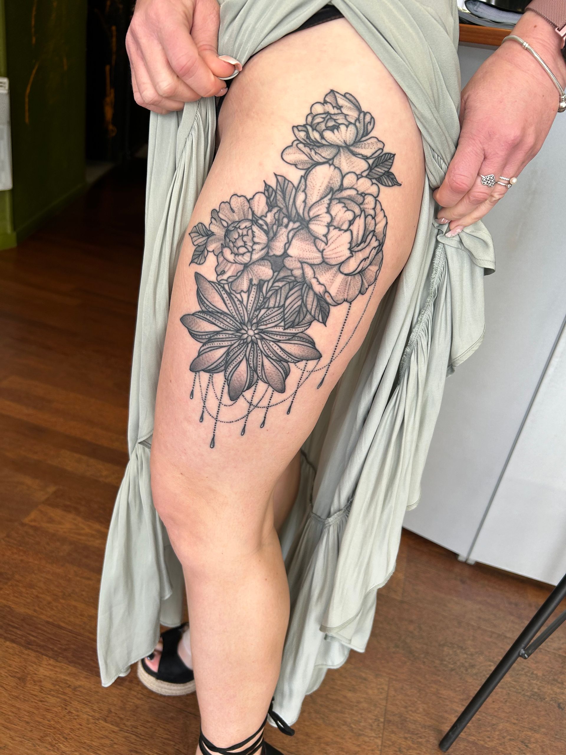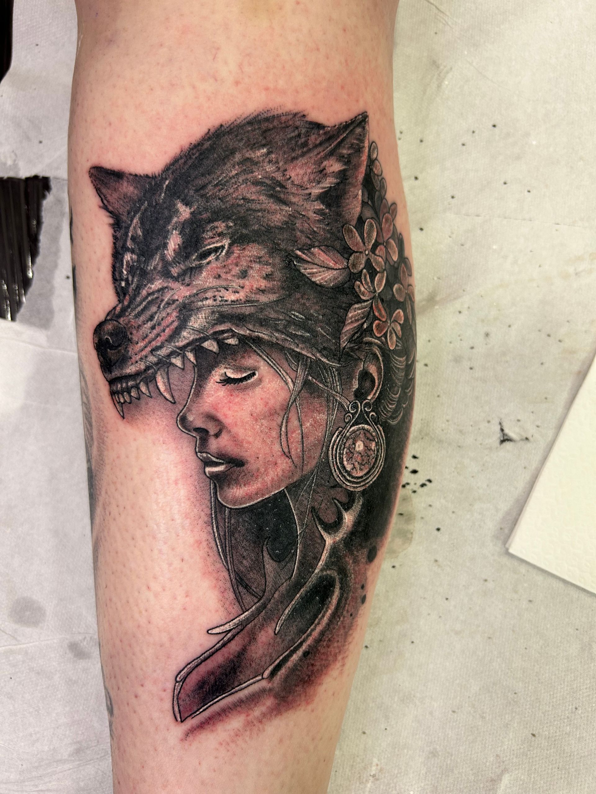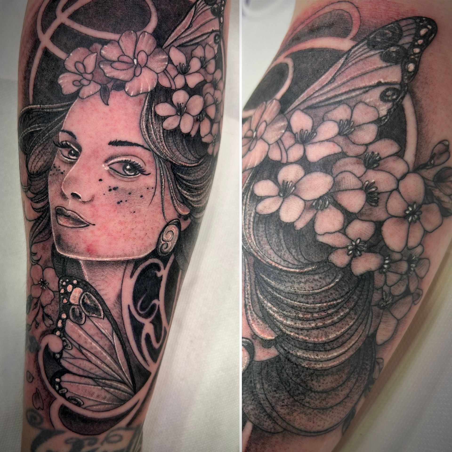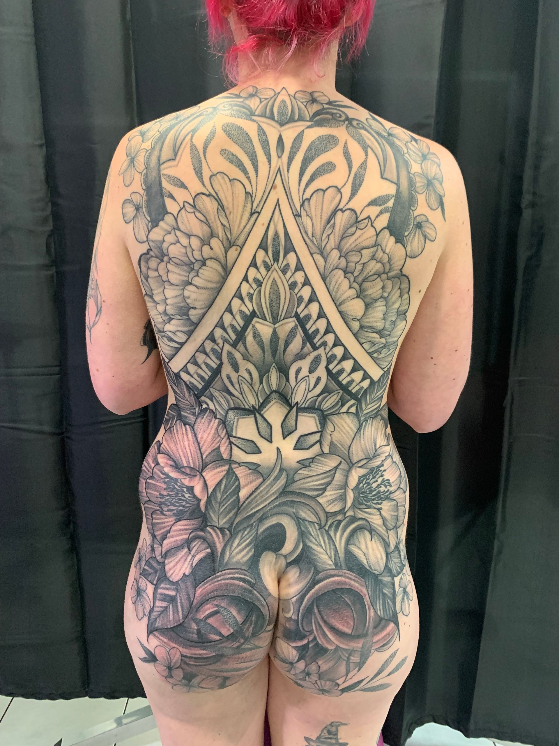 Tatoueuse depuis 12 ans, Delphine propose un univers très girly orné de fleurs et de dentelle aux tendances réalistes, mais aussi un travail d'inspiration mandala en dot, en noir ou en couleur.