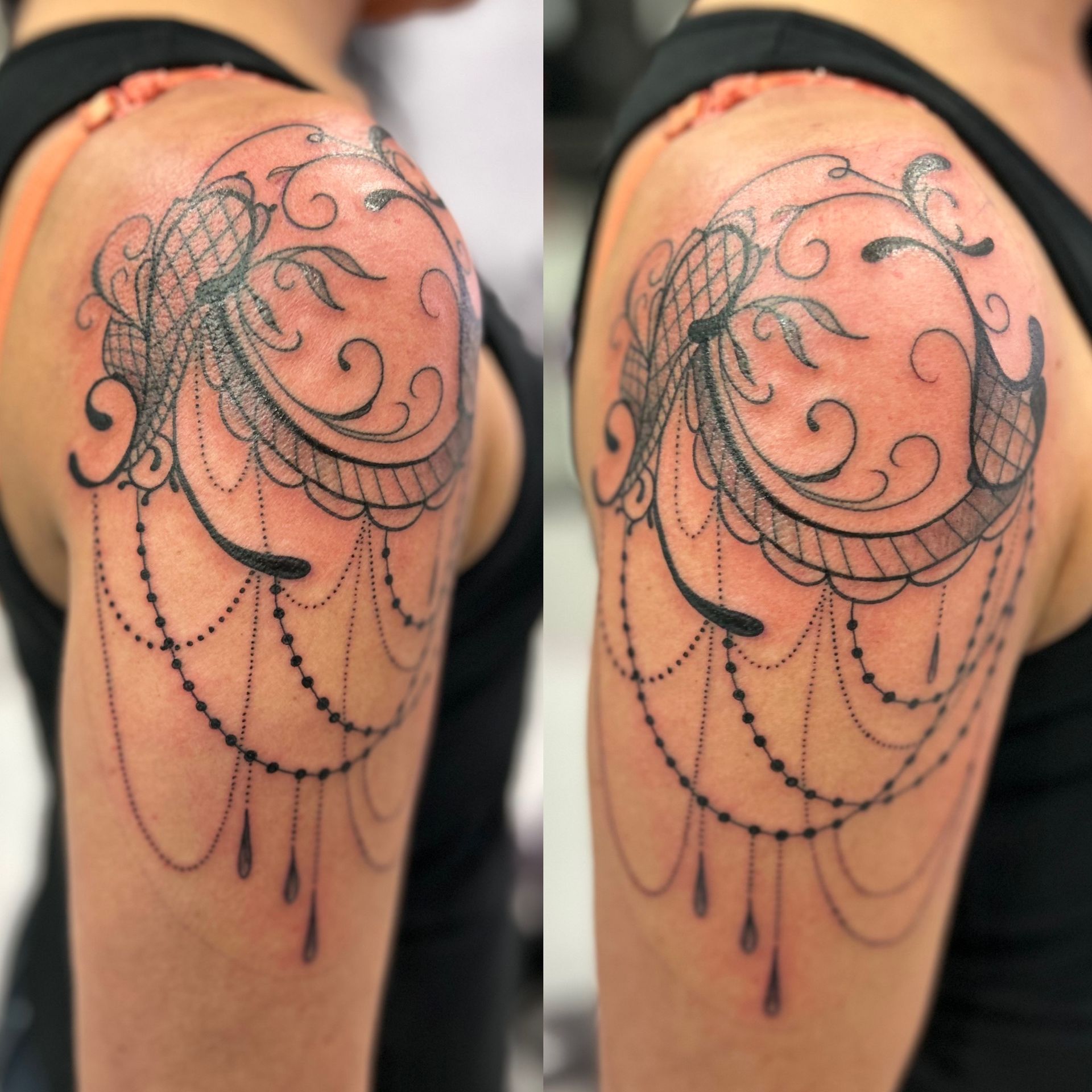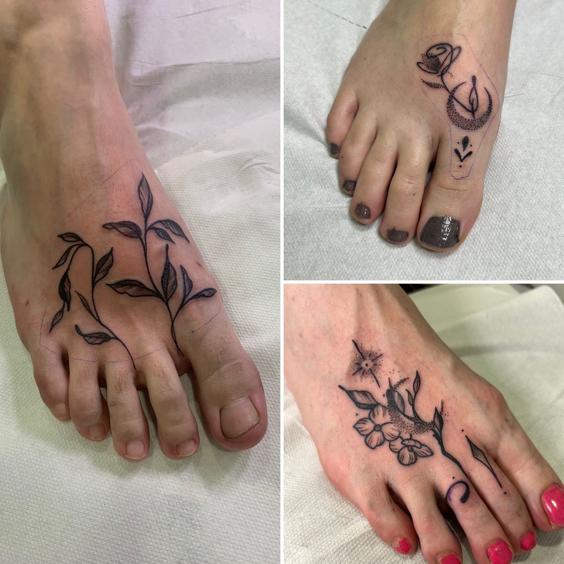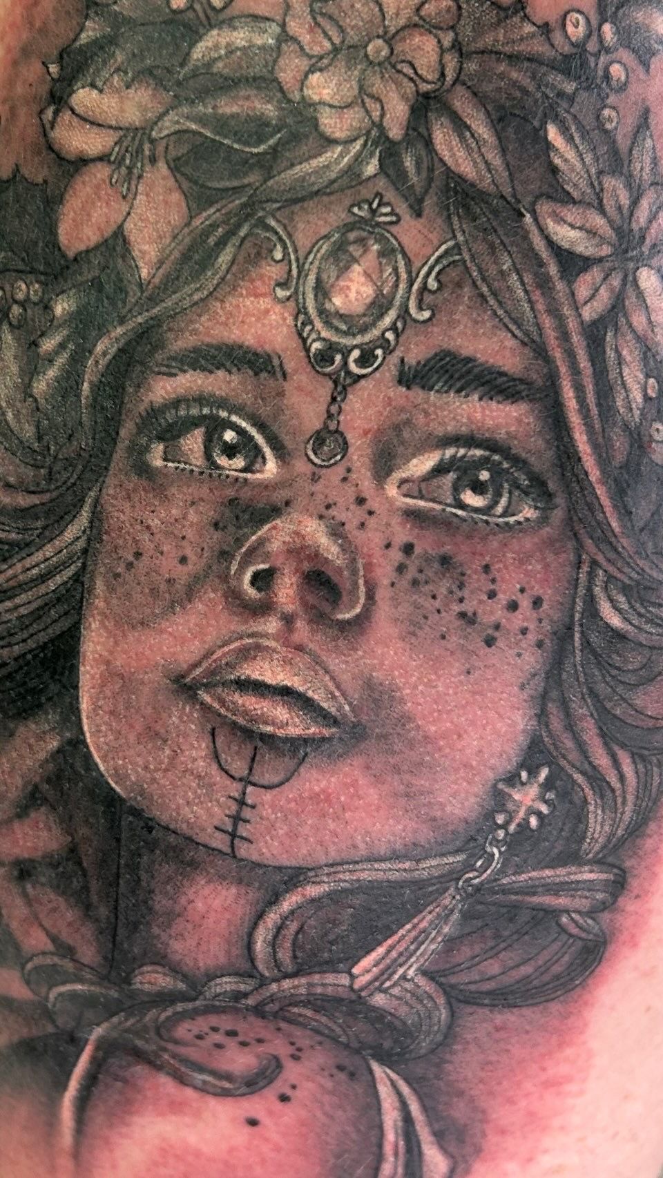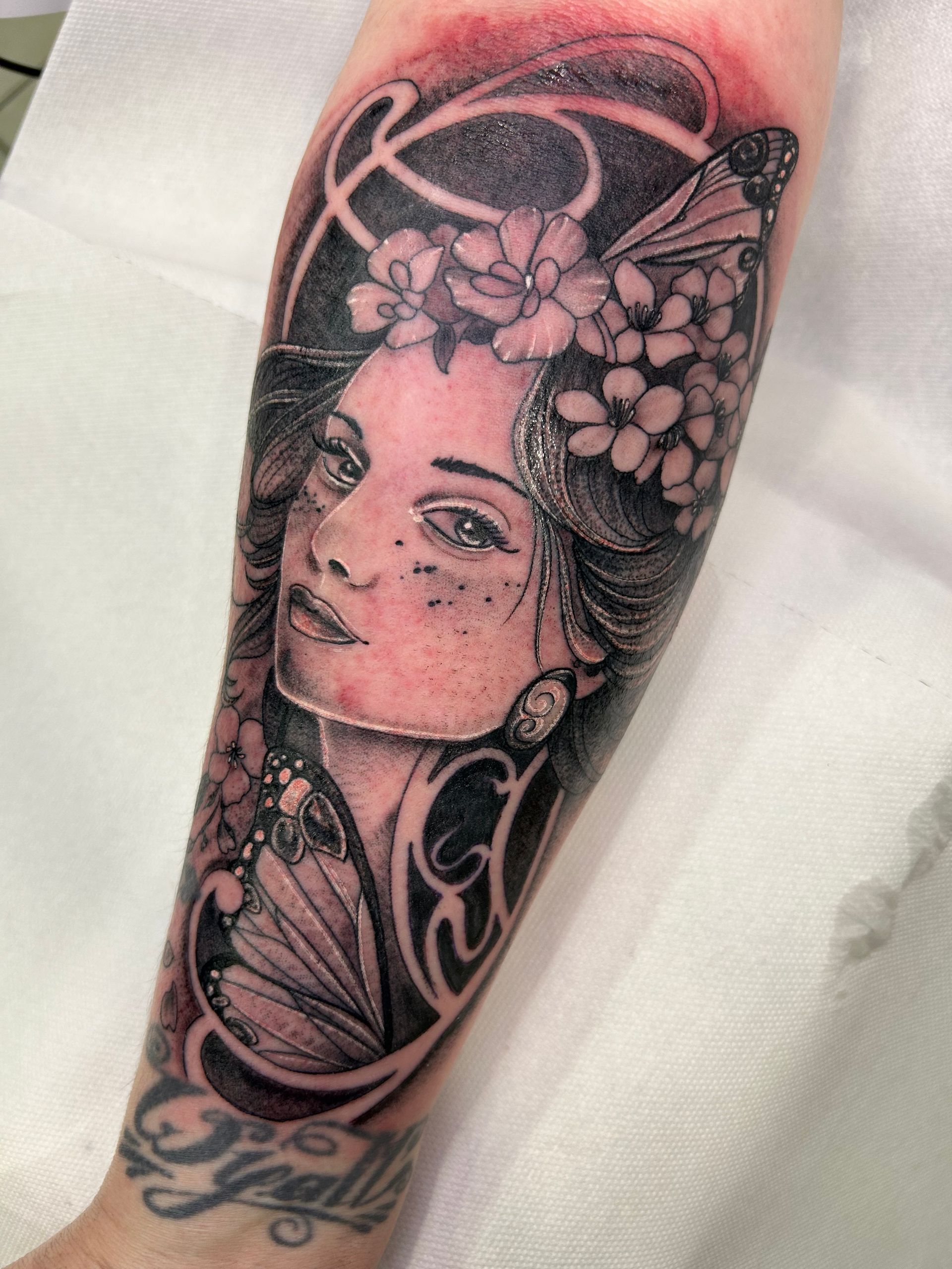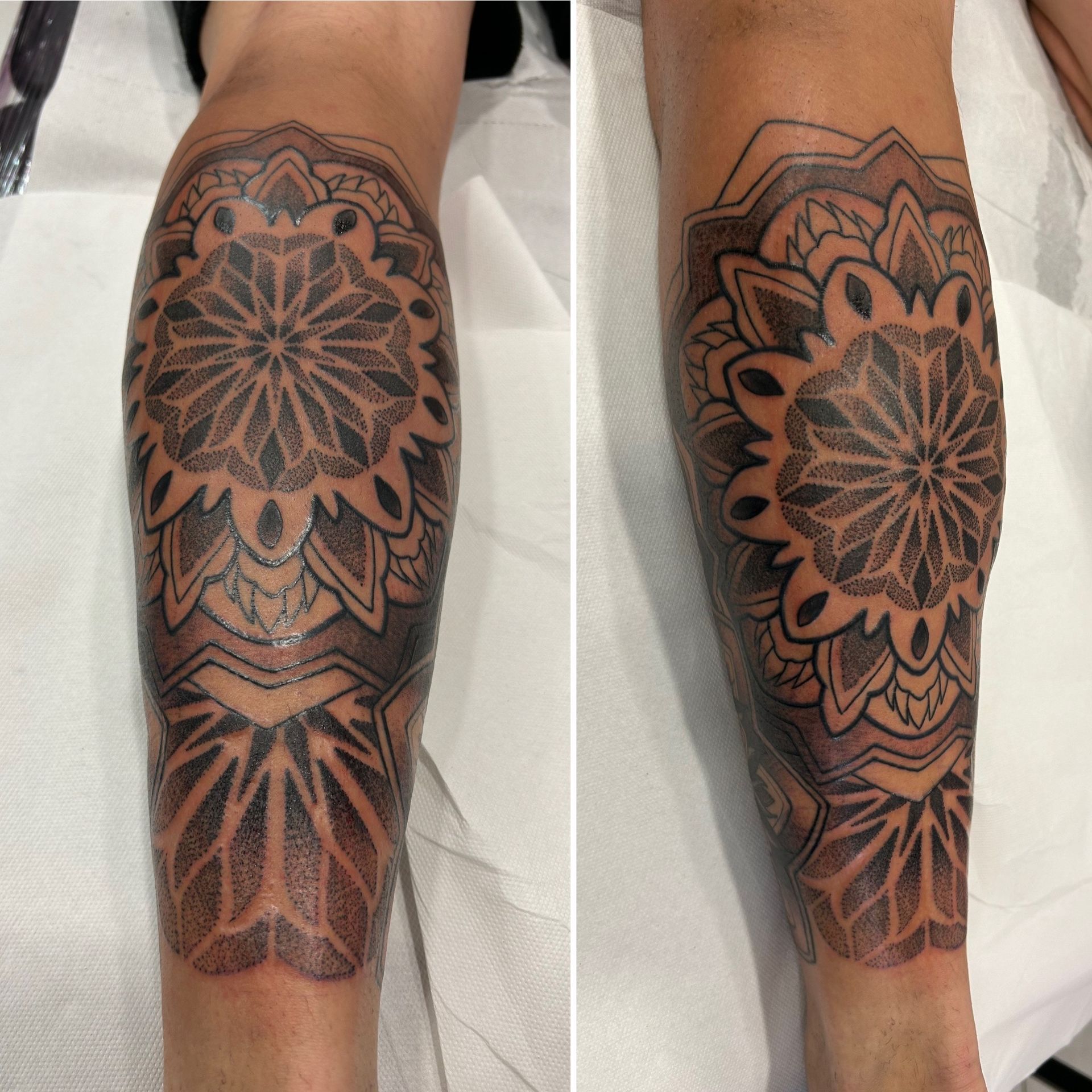 Tatoueuse depuis 12 ans, Delphine propose un univers très girly orné de fleurs et de dentelle aux tendances réalistes, mais aussi un travail d'inspiration mandala en dot, en noir ou en couleur.