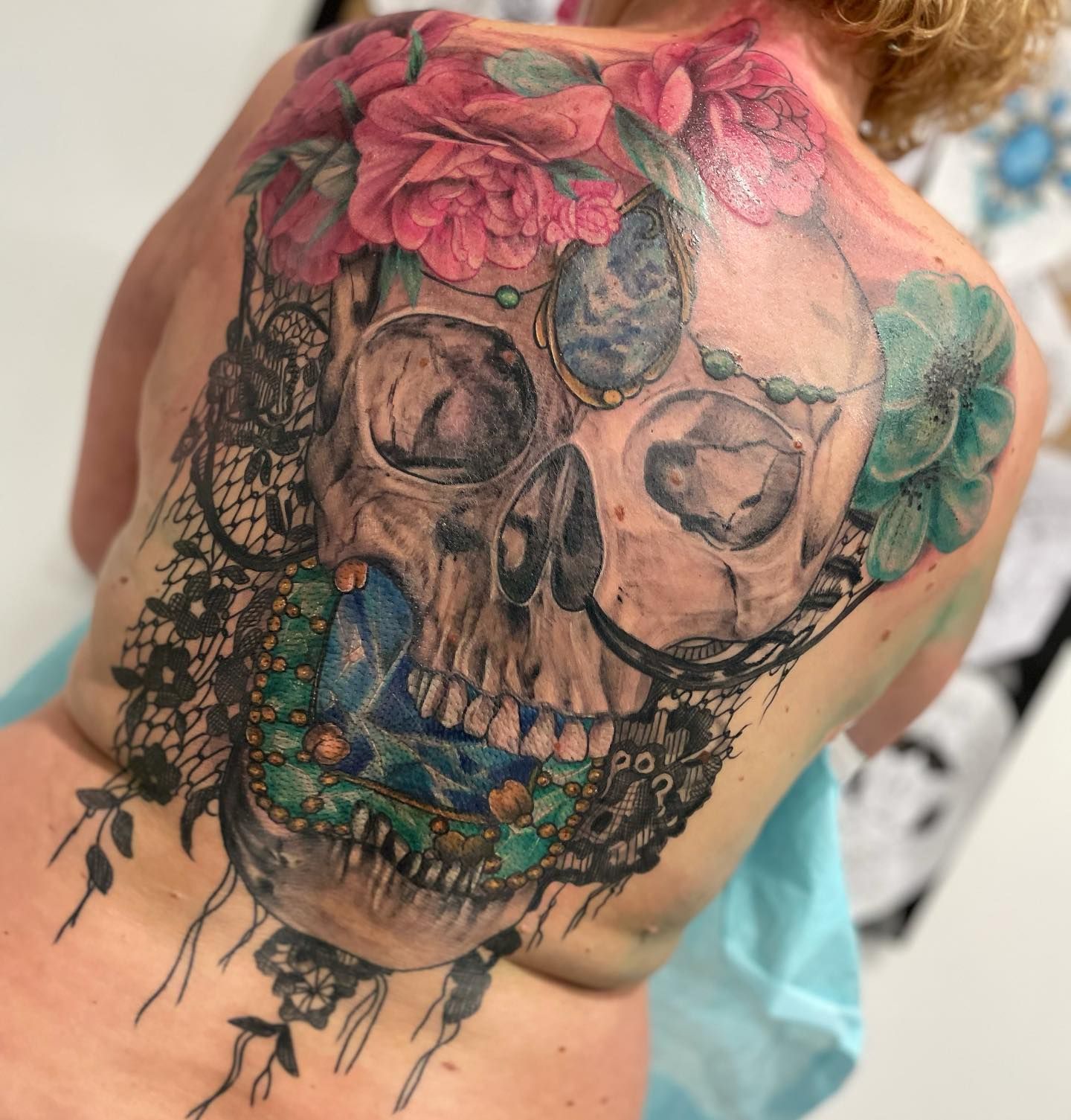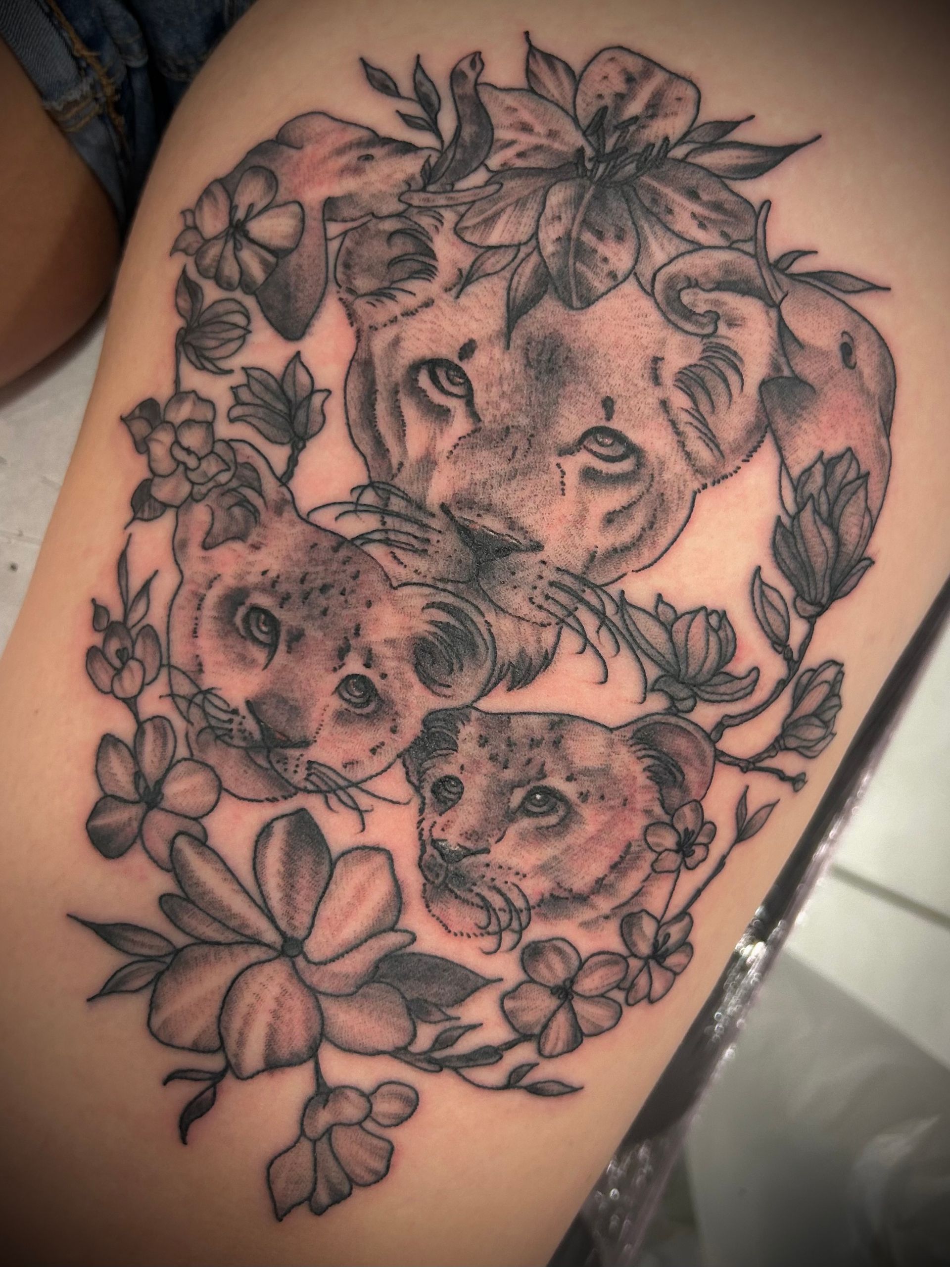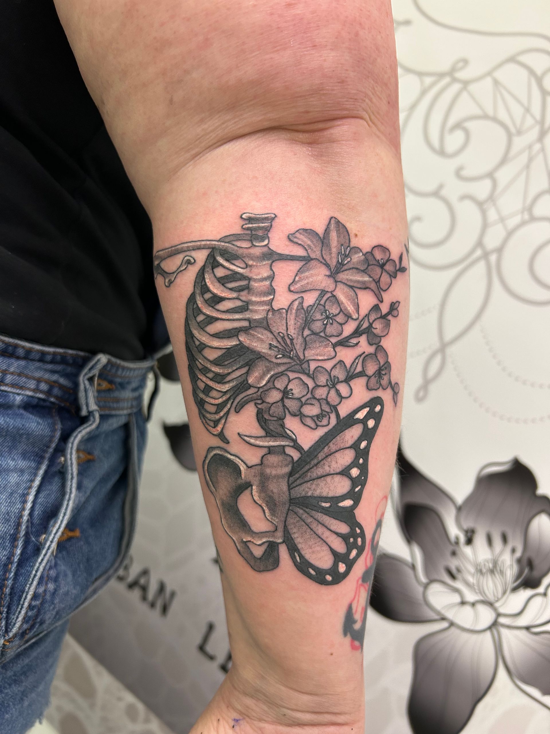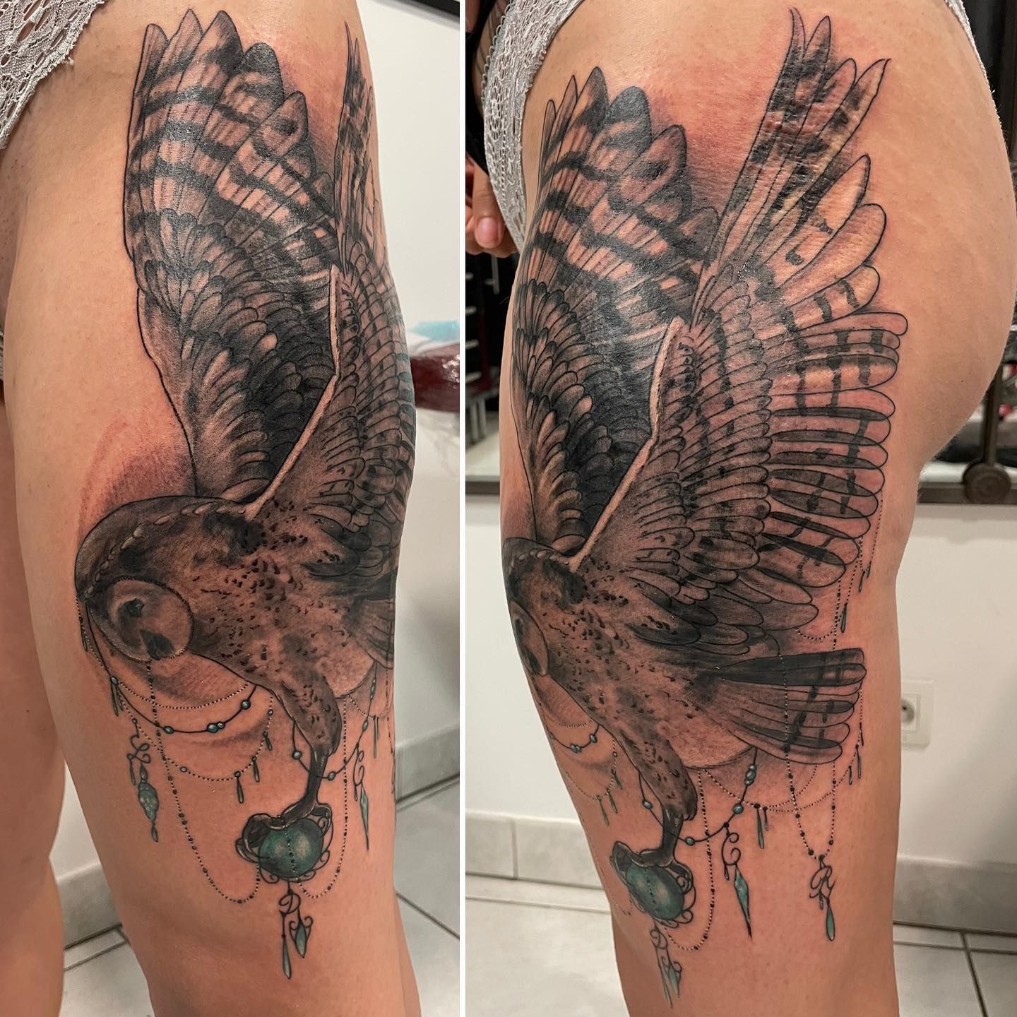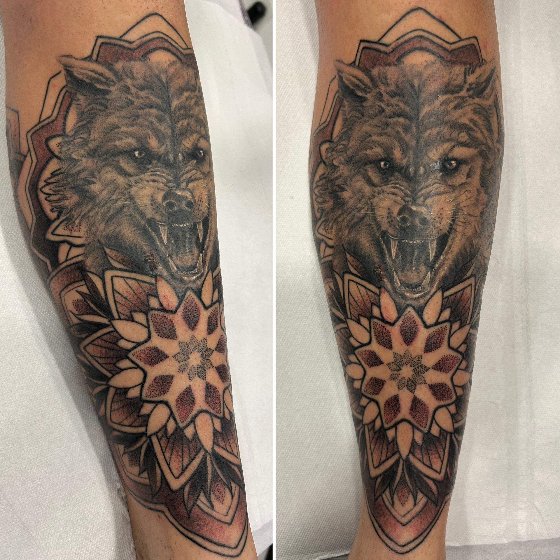 Tatoueuse depuis 12 ans, Delphine propose un univers très girly orné de fleurs et de dentelle aux tendances réalistes, mais aussi un travail d'inspiration mandala en dot, en noir ou en couleur.