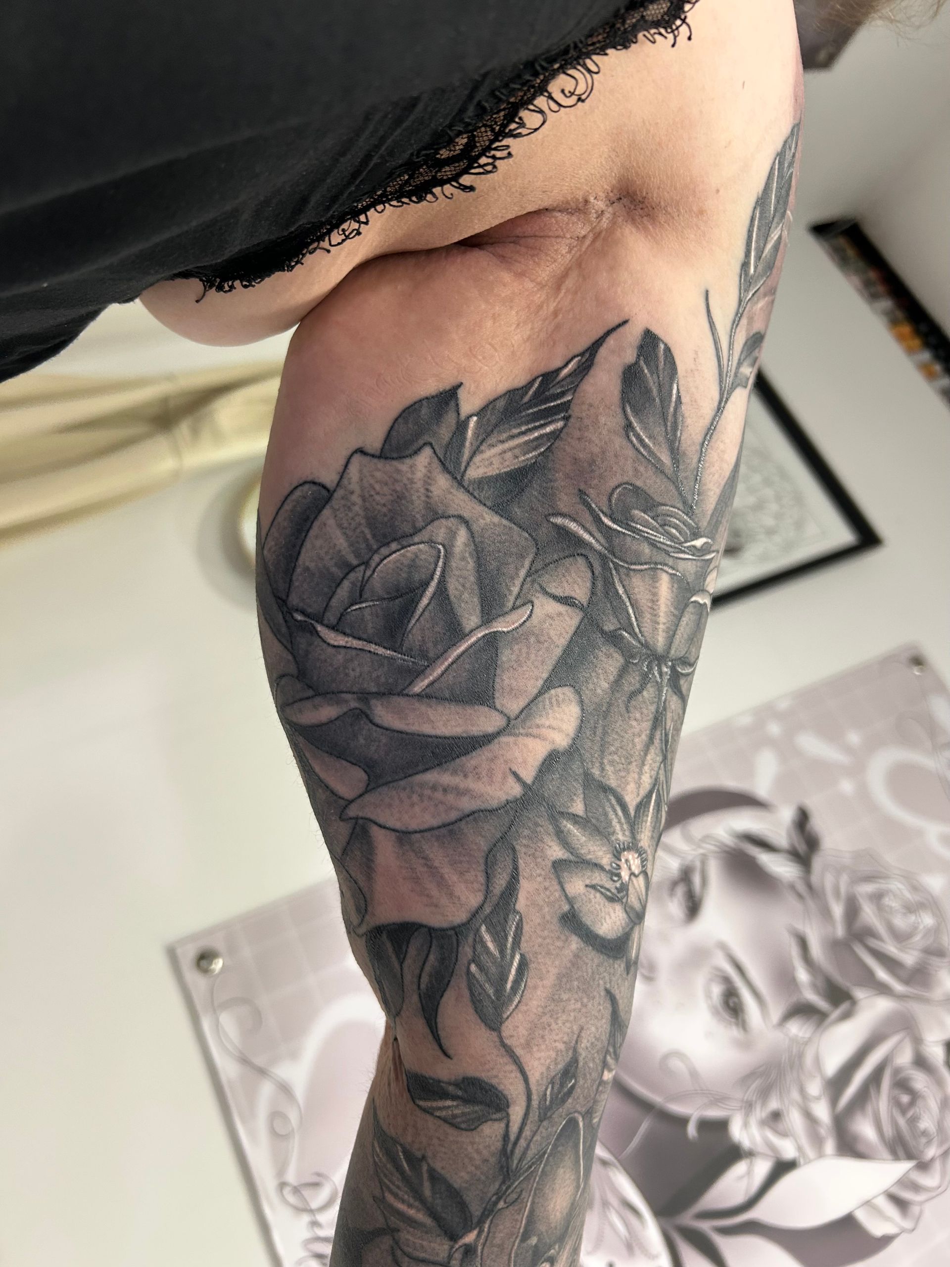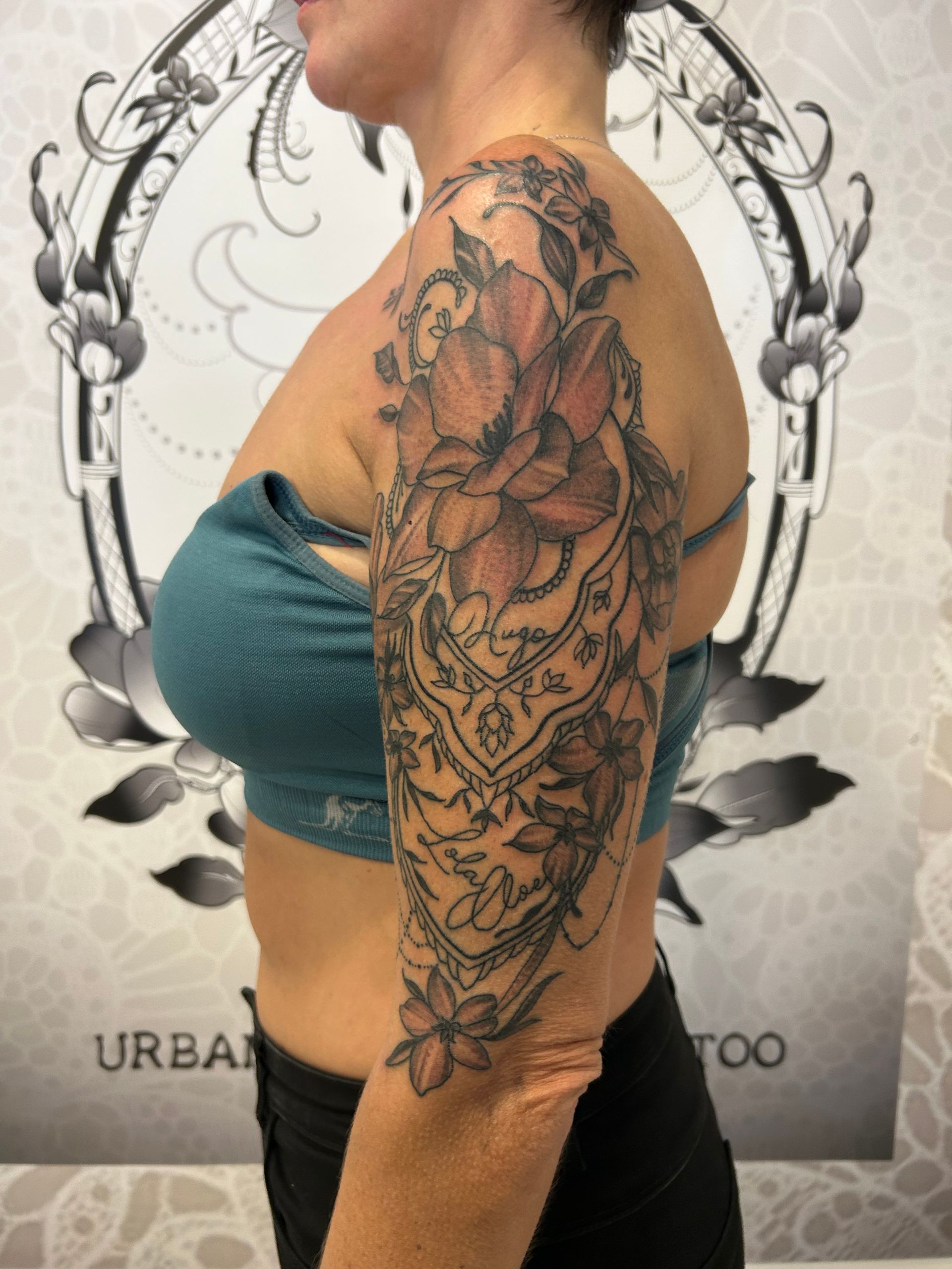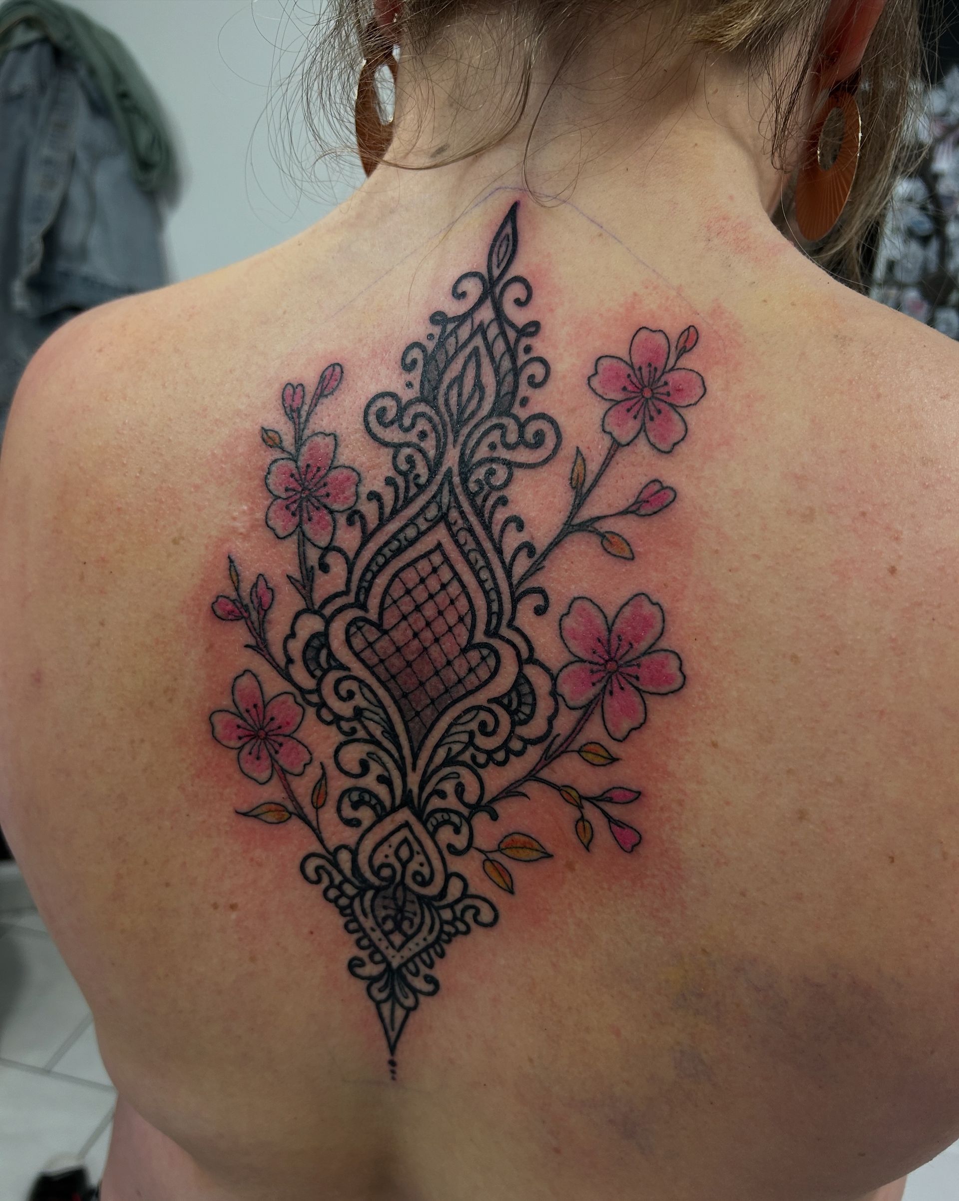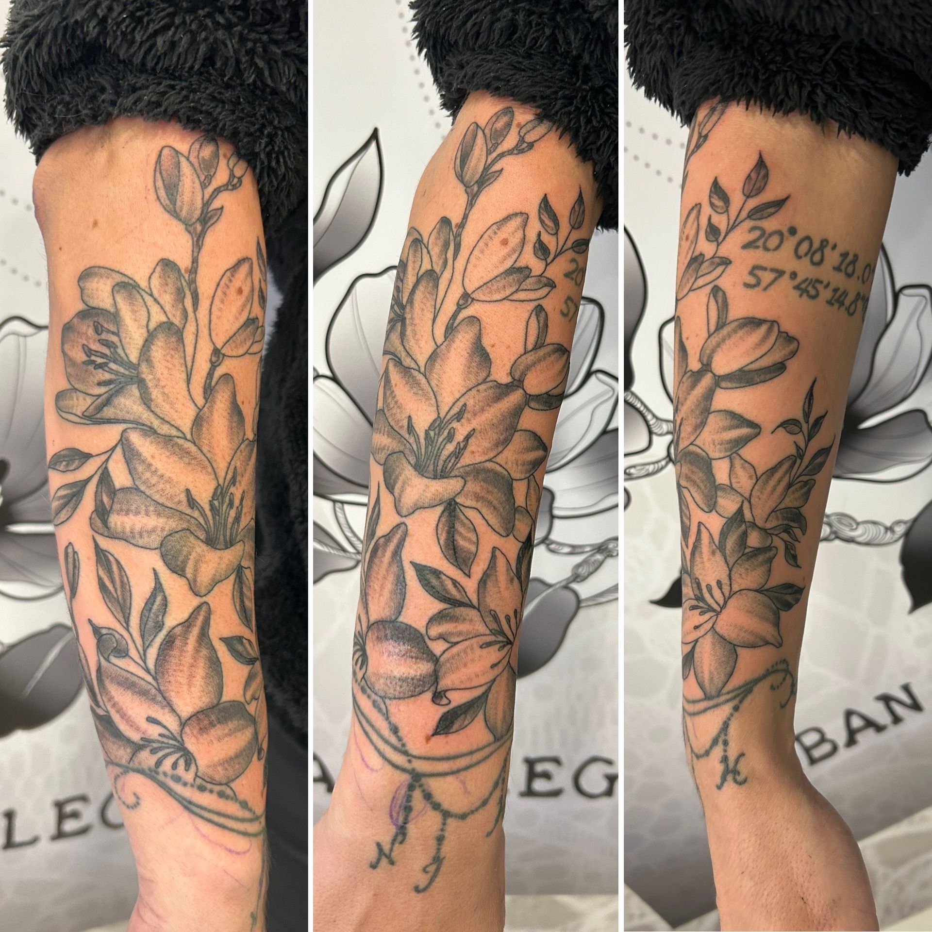 Tatoueuse depuis 12 ans, Delphine propose un univers très girly orné de fleurs et de dentelle aux tendances réalistes, mais aussi un travail d'inspiration mandala en dot, en noir ou en couleur.