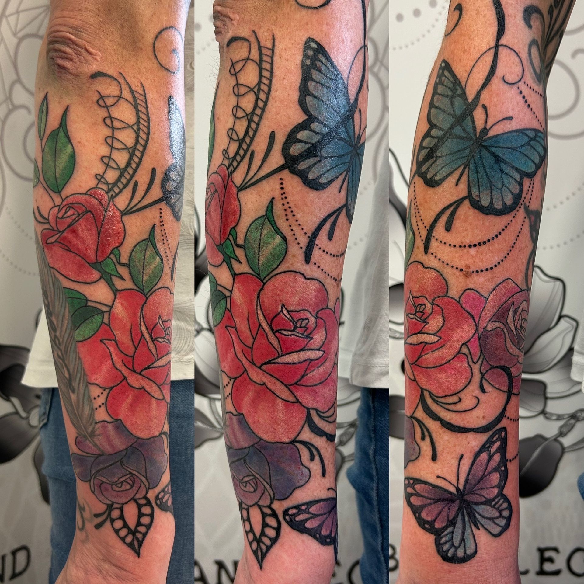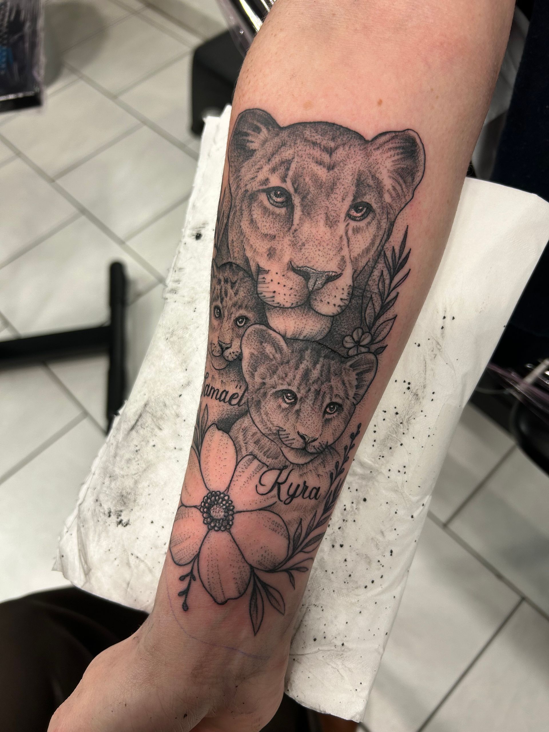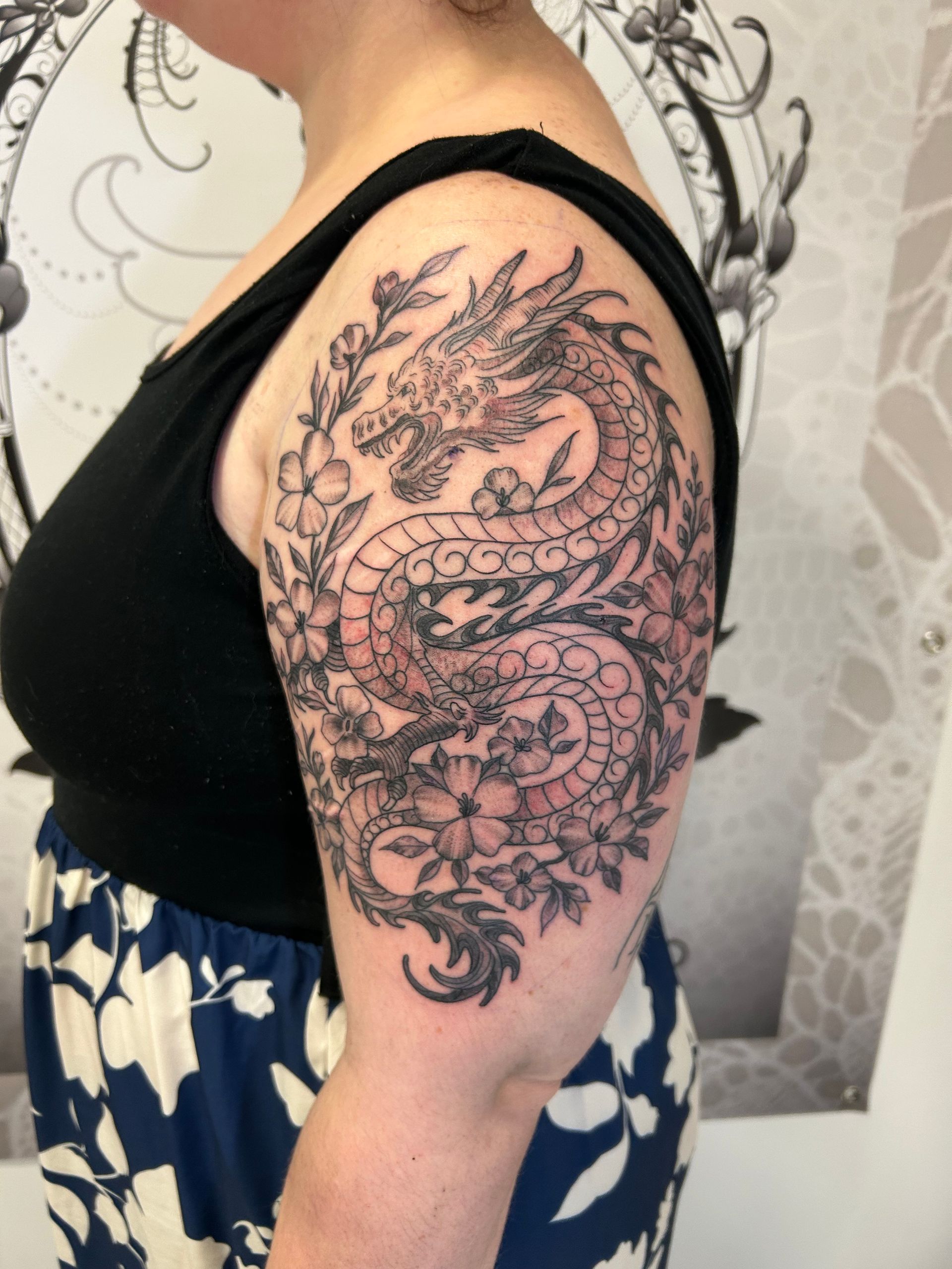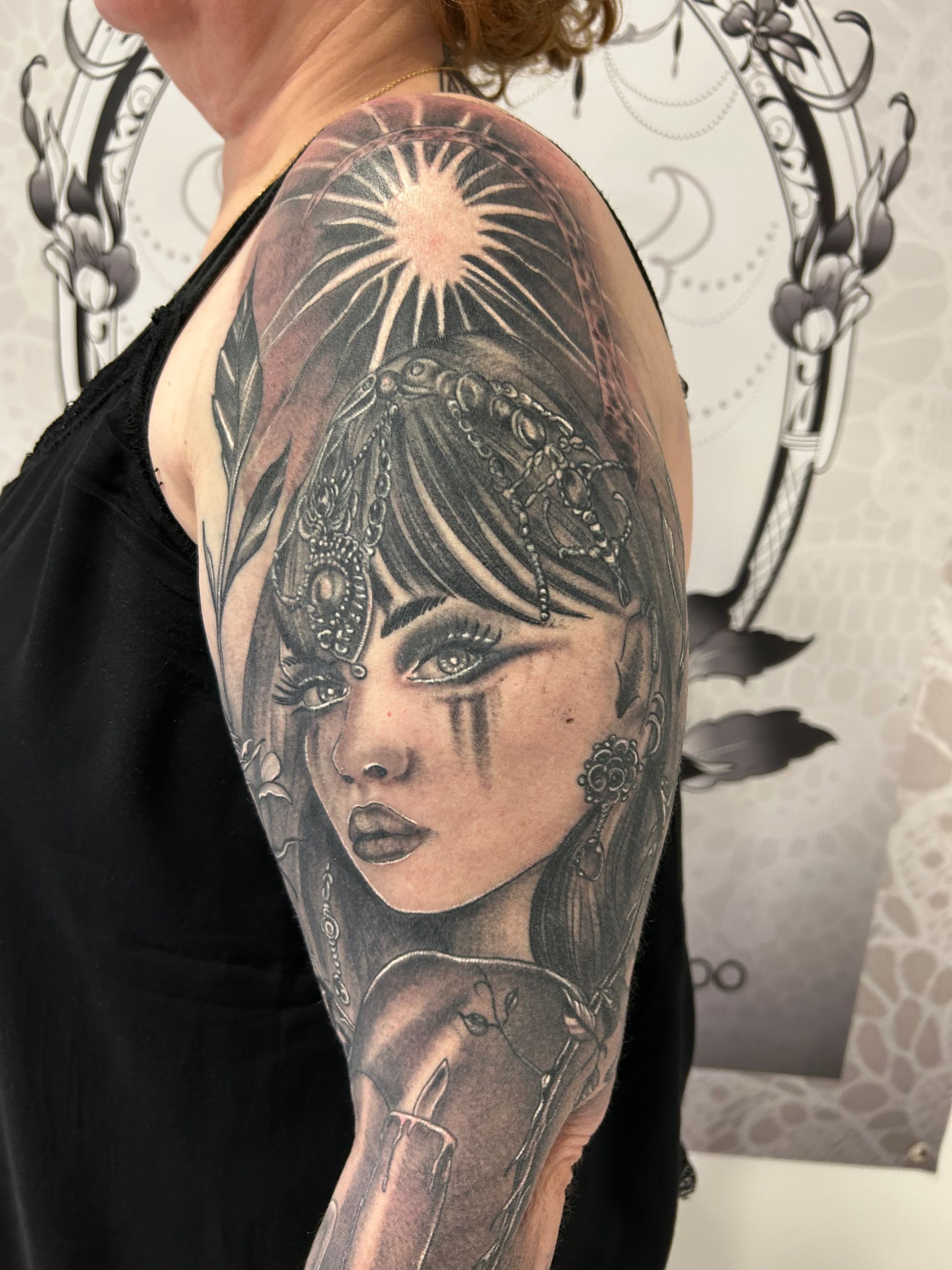 Tatoueuse depuis 12 ans, Delphine propose un univers très girly orné de fleurs et de dentelle aux tendances réalistes, mais aussi un travail d'inspiration mandala en dot, en noir ou en couleur.